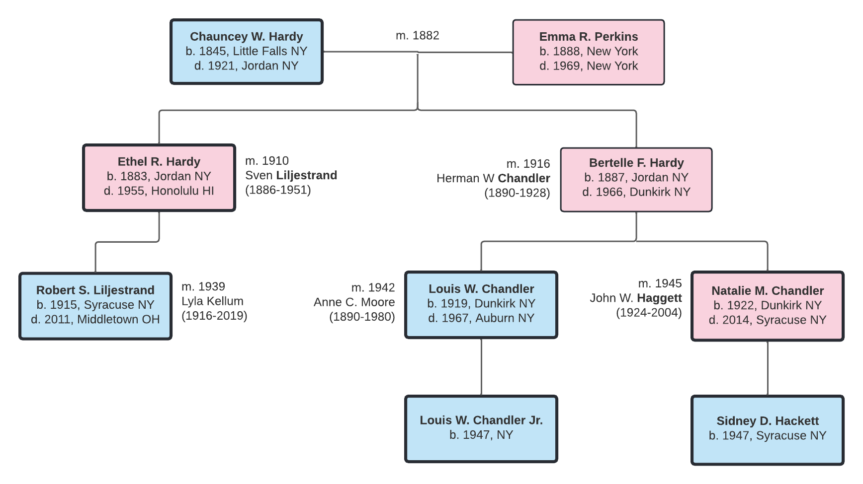 Jim has Chandler 2nd cousins who are descended from Bertelle Hardy, sister of his father’s mother Ethel Hardy.