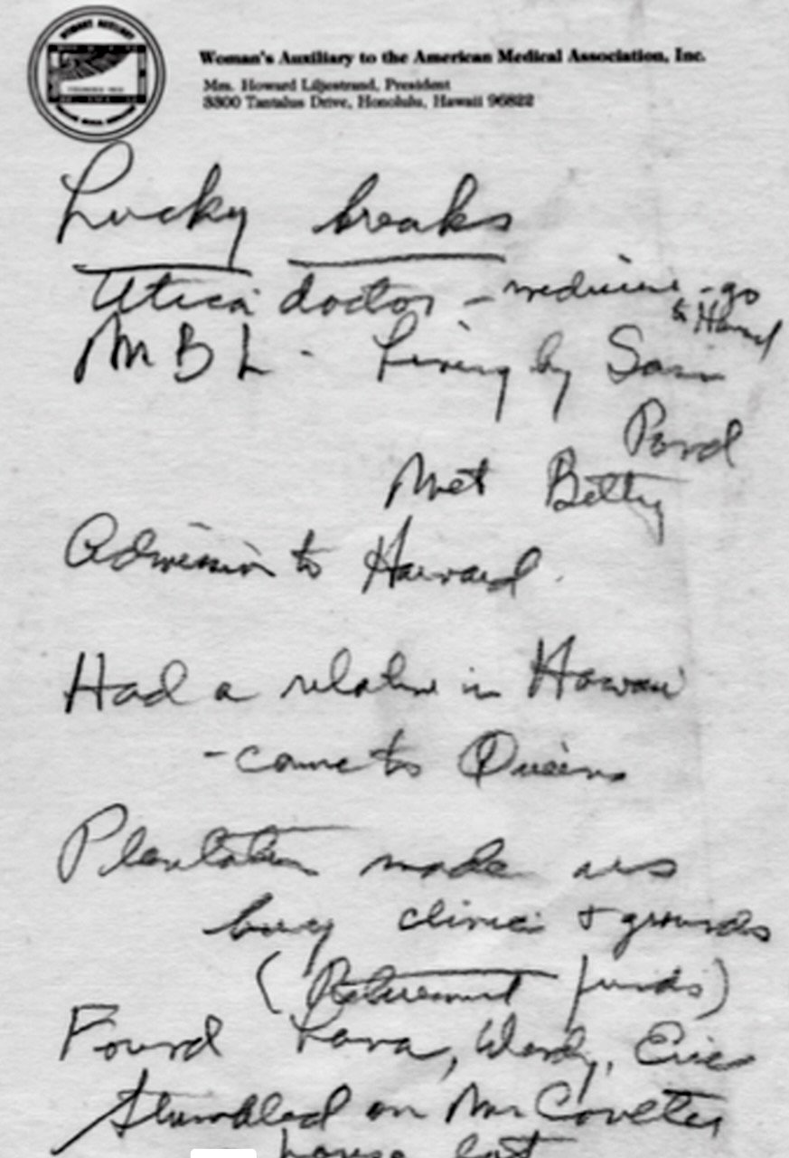 Once in 1979 at a AAPMR (American Academy of Physical Medicine and Rehabilitation) in Honolulu where Jim was to present a paper he got a call from ‘Aunt Betty” saying why are you staying down at that horrible Waikiki beach when you could be up here with us. So Jim checked out, rented a little stick shift Fiat and moved up to Tantalus Drive house. One can see the house today - see the Liljestrand Foundation website for more details. Their guest bedroom overlooked Pearl Harbor, Punch Bowl and off to the left Diamond Head. She did daily laps in their pool with 25 pebbles and moved them from one pile to another to keep track of her laps. Howard was a night owl and be up to 2 am working on his documentary films in the basement with classical music blaring, Trudy (still working for the Liljestrand Foundation in 2023) was the office manager and facilities manager and looked after the guests needs like towels and sheets. It was on one of these trips to Honolulu where we spent on a Saturday 2 hours listening to Garrison Keillor from Prairie Home Companion on NPR. He never missed a broadcast and after that neither did we.