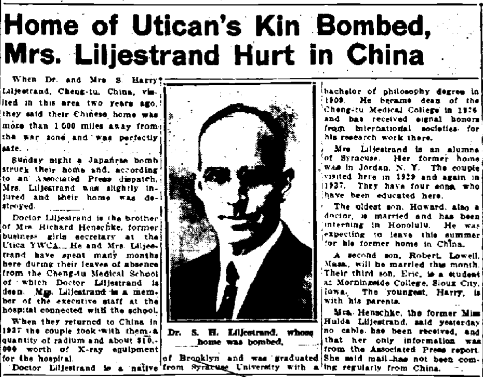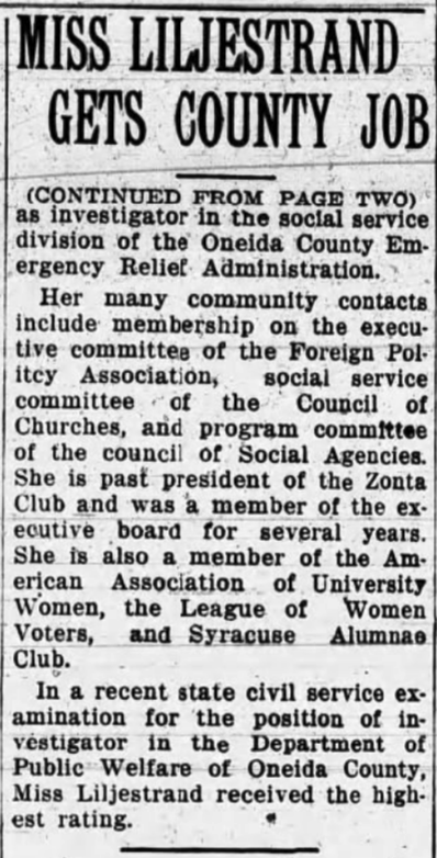 Hulda was the second child and only daughter of Swedish immigrants Herman and Hannah (Svennson) Liljestrand. She was born 30 Jun 1894 in Pawling, New York to Swedish immigrants Herman and Hanna (Swenson) Liljestrand. When she was twelve years old, her mother brought her along on a trip to Sweden to visit her relatives (see Hanna Swenson page). In 1938 at the age of 44, she married the widower Richard Henschke in Clinton, NY, who had four grown children by his former wife Clara Schmitt. She was college-educated at Syracuse University, had a career as a YWCA secretary and a welfare investigator and was active in church and volunteer work. The following documents, photographs and newspaper clippings document Hulda’s life story.