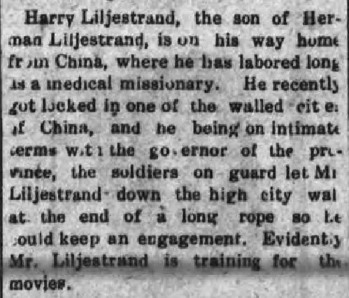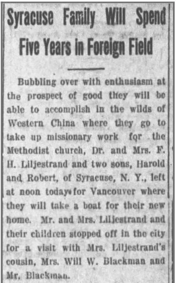 My grandfather Sven “Harry” Liljestrand was a missionary doctor who spent 32 years in China at the West China Medical Center in Chengdu, Sichuan province. He was born 6 Jun 1886 in Brooklyn, New York to Swedish immigrants Herman and Hanna (Swenson) Liljestrand. When he was five years old, his mother brought him along on a trip to Sweden to visit her relatives (see Hanna Swenson page). The following documents, photographs and newspaper clippings document Harry’s life story.