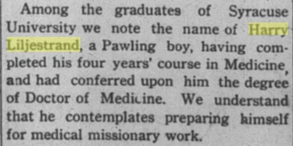 Sven Herman Liljestrand, M.D. is buried along with his parents in the Pawling Cemetery in Pawling, New York.