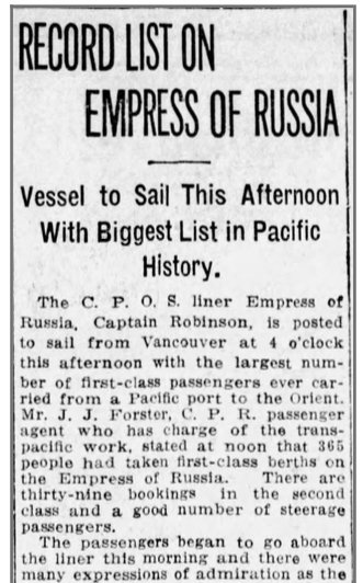 The Sven, Ethel, Howard and Robert Liljestrand embarked to China on August 10, 1916 from Vancouver, British Columbia, Canada on the Empress of Russia, to begin their 7 month journey to western China.